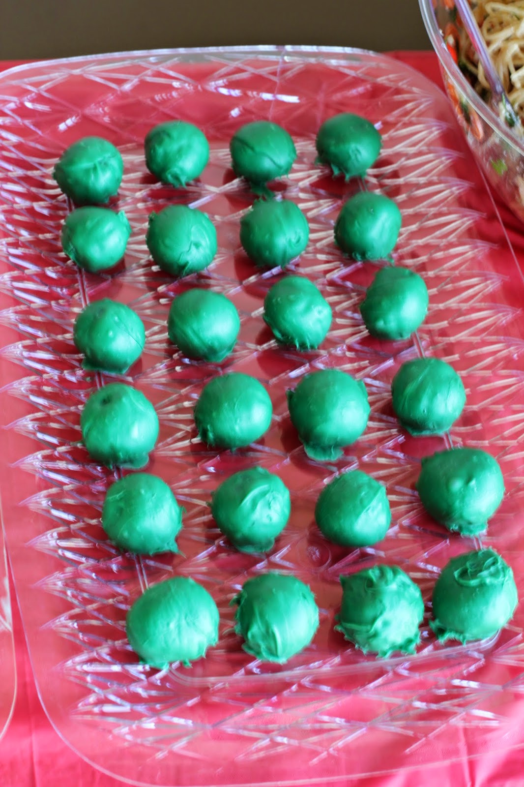 Oreo Truffles (covered in green candy melts which I intended to decorate as the French Peas, but again I ran out of time so we just had plain green)